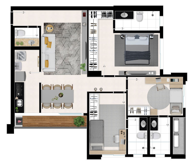 A planta que recebe destaque no Urbani Vista Home é a de 170m² e 3 suítes. O grande diferencial dessa unidade é que ela conta com 3 vagas de garagem e uma piscina privativa na varanda gourmet. Além disso, a unidade apresenta churrasqueira ecológica (que não produz fumaça) e varanda do tipo balcão conectada à sala.